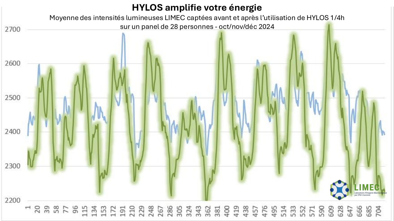Évolution des intensités lumineuses mesurées par LIMEC avant (bleu) et après (vert) une séance de 14 minutes avec Hylos